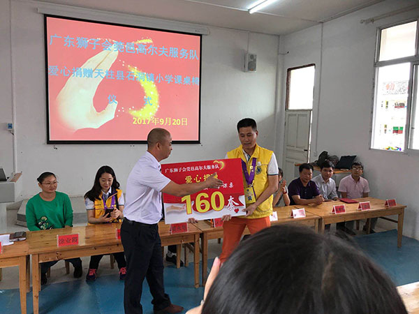 2017年9月17-21日,广东狮子会莞邑高尔夫服务队来到贵州市天柱县石洞乡镇小学开展助学活动,为学生们捐赠160套新学期爱心课桌椅。